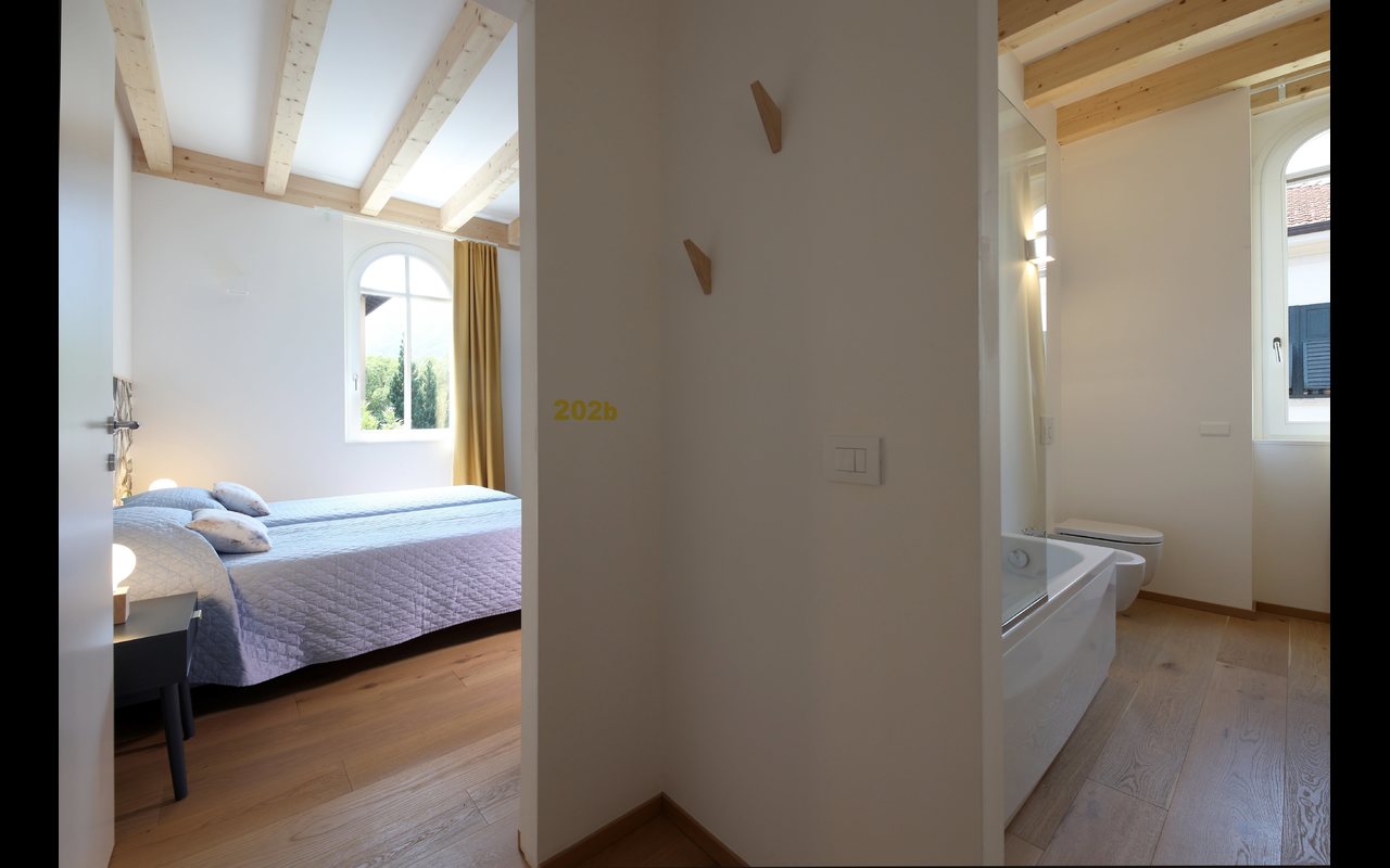 Connecting rooms with shared bathroom, one double and one quadruple, in a renovated early 20th-century building.